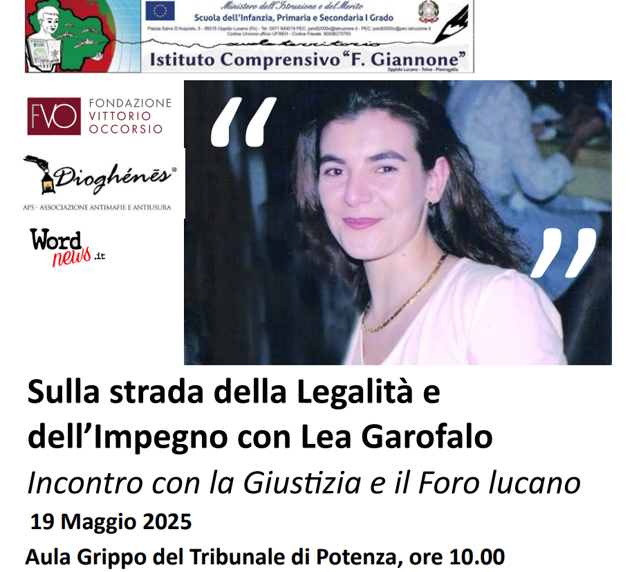 Lunedì 19 Maggio, presso l’Aula Grippo del Tribunale di Potenza, alle ore 10.00 i ragazzi e i docenti della Scuola secondaria di primo grado dell’I.C. “F. Giannone” dei Plessi di Acerenza, Cancellara, Oppido L., Pietragalla, San Chirico Nuovo e Tolve saranno protagonisti del seminario “Sulla strada della Legalità e dell’Impegno con Lea Garofalo”, un incontro con la Giustizia e il Foro lucano rappresentati dalla Dott.ssa Lucia Casale, Presidente f.f. della Corte d’Appello di Potenza e dal Dr. Armando D’Alterio, Procuratore generale della Repubblica presso la Corte d’appello di Potenza.