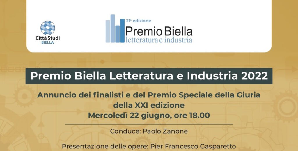 Mercoledì 22 giugno, alle 18 si terrà la conferenza stampa/evento di presentazione della XXI edizione del Premio Biella Letteratura e Industria con l’annuncio dei finalisti e la proclamazione del Premio Speciale della Giuria.