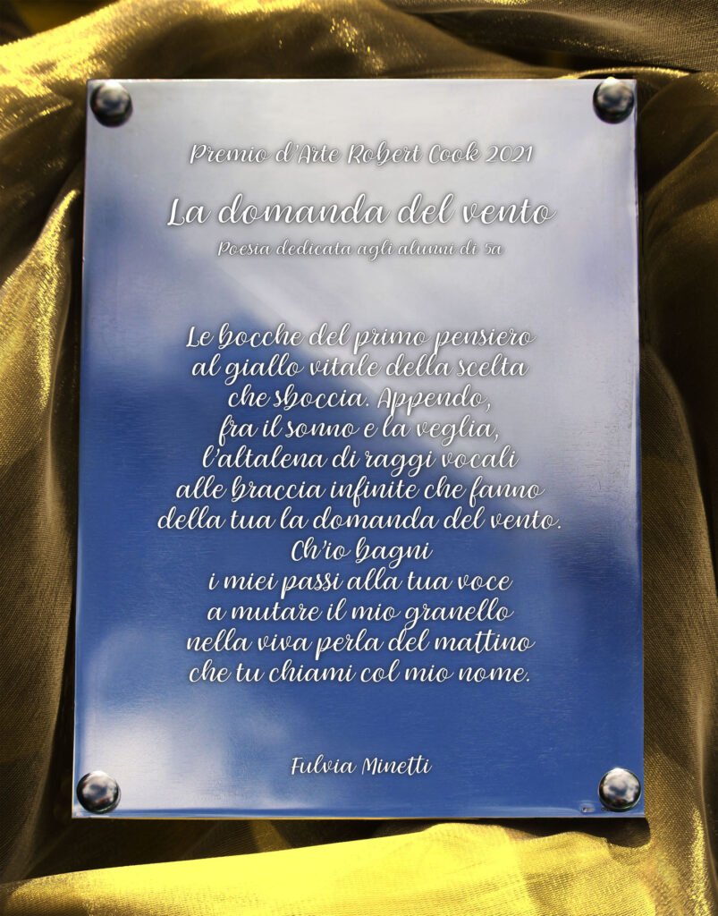 Il Comune inaugura l’esposizione permanente della targa in argento della poesia di Fulvia Minetti “La domanda del vento”, dedicata alle opere degli alunni di quinta classe, per augurio al divenire dell’arte di essere, dell’arte stessa del vivere, a celebrare il senso della bellezza nel superamento di sé nell’altro. “Le bocche del primo pensiero / al giallo vitale della scelta / che sboccia. Appendo, / fra il sonno e la veglia, / l’altalena di raggi vocali / alle braccia infinite che fanno / della tua la domanda del vento. / Ch’io bagni / i miei passi alla tua voce / a mutare il mio granello / nella viva perla del mattino / che tu chiami col mio nome”.