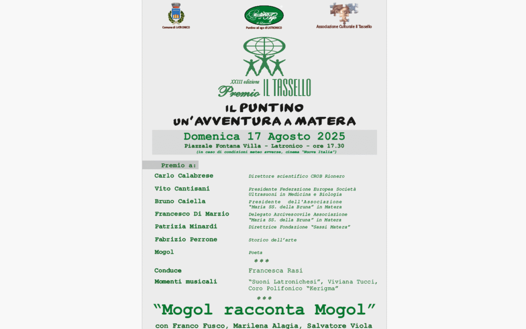 La cerimonia di consegna, condotta da Francesca Rasi, si svolgerà domenica 17 agosto alle 17.30 nel piazzale Fontana Villa (in caso di condizioni meteo avverse nel Cinema Nuova Italia) a Latronico e sarà allietata da momenti musicali dei “Suoni Latronichesi”, Viviana Tucci e il Coro Polifonico “Kerigma”.