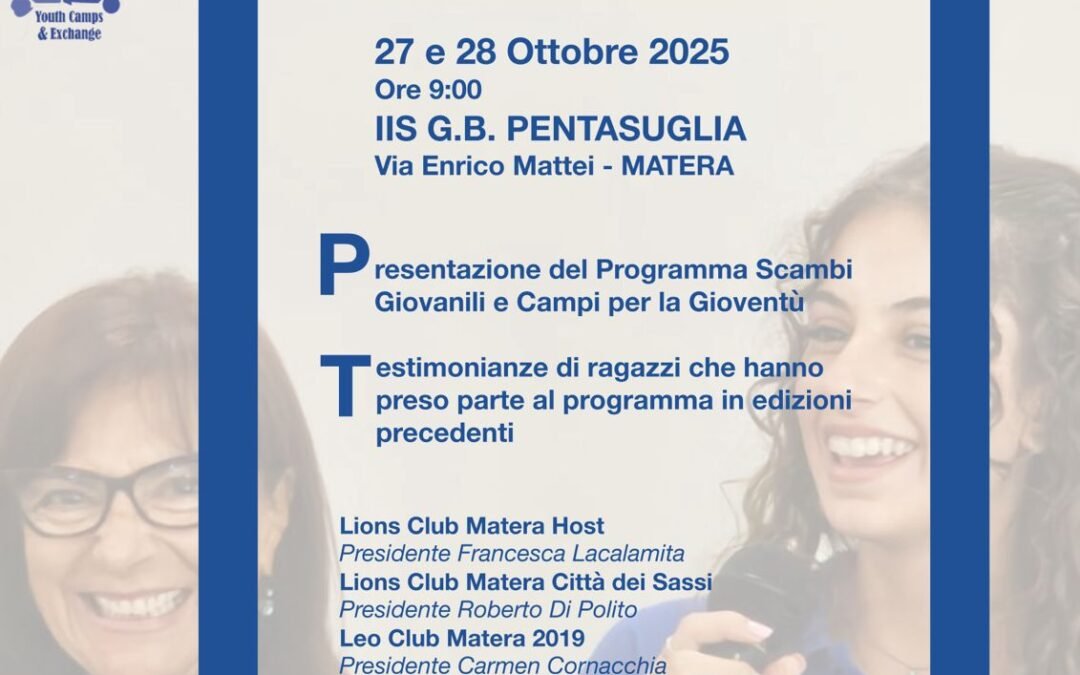 I Club Lions di Matera presenteranno lunedì 27 e martedì 28 ottobre il Programma Scambi Giovanili e Campi Lions agli studenti dell’IIS “GB Pentasuglia” in Via Mattei di Matera con inizio in entrambi i casi alle ore 9,00.