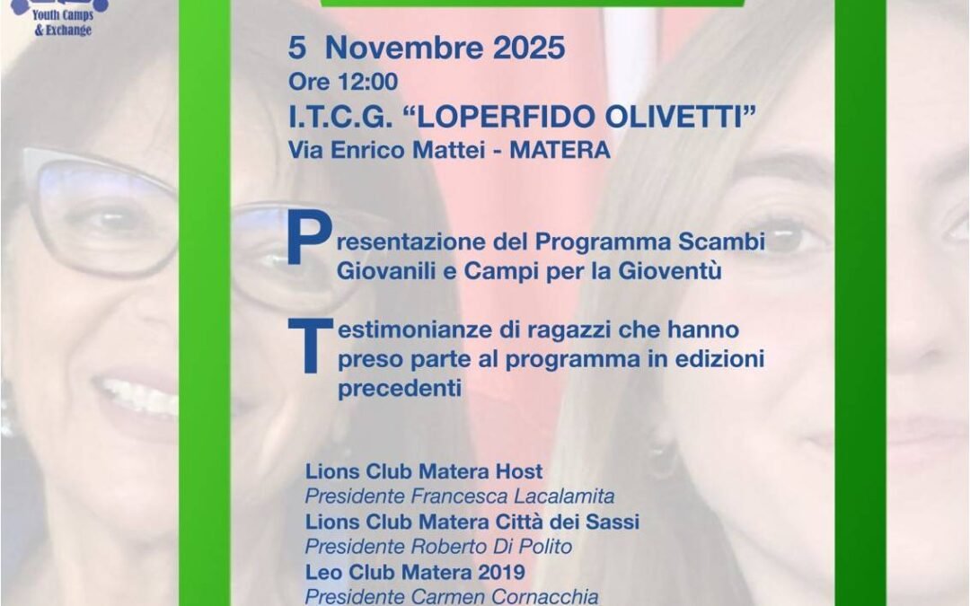 Mercoledì 5 novembre 2025 alle ore 12 nell’Aula magna dell’I.T.C.G. “Loperfido-Olivetti” in via Mattei a Matera i Club Lions di Matera presenteranno il Programma Scambi Giovanili e Campi Lions agli studenti della scuola.