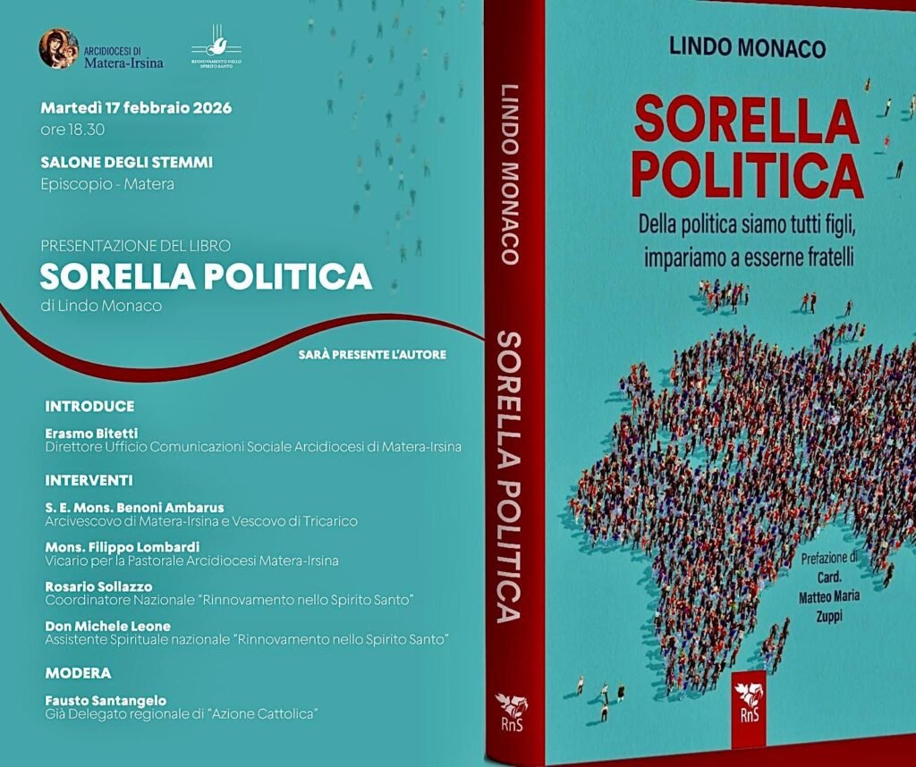 Martedì 17 febbraio 2026, alle ore 18.30, nel Salone degli Stemmi dell’Episcopio di Matera, sarà presentato il libro Sorella politica. Della politica siamo tutti figli, impariamo a esserne fratelli di Lindo Monaco, alla presenza dell’autore.