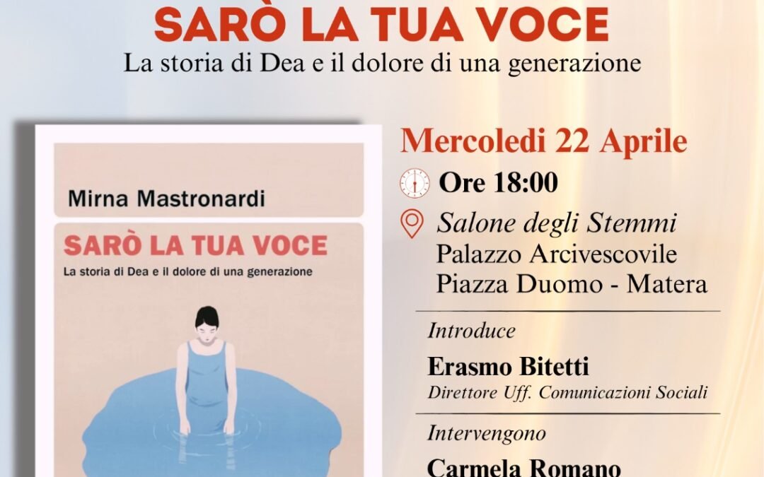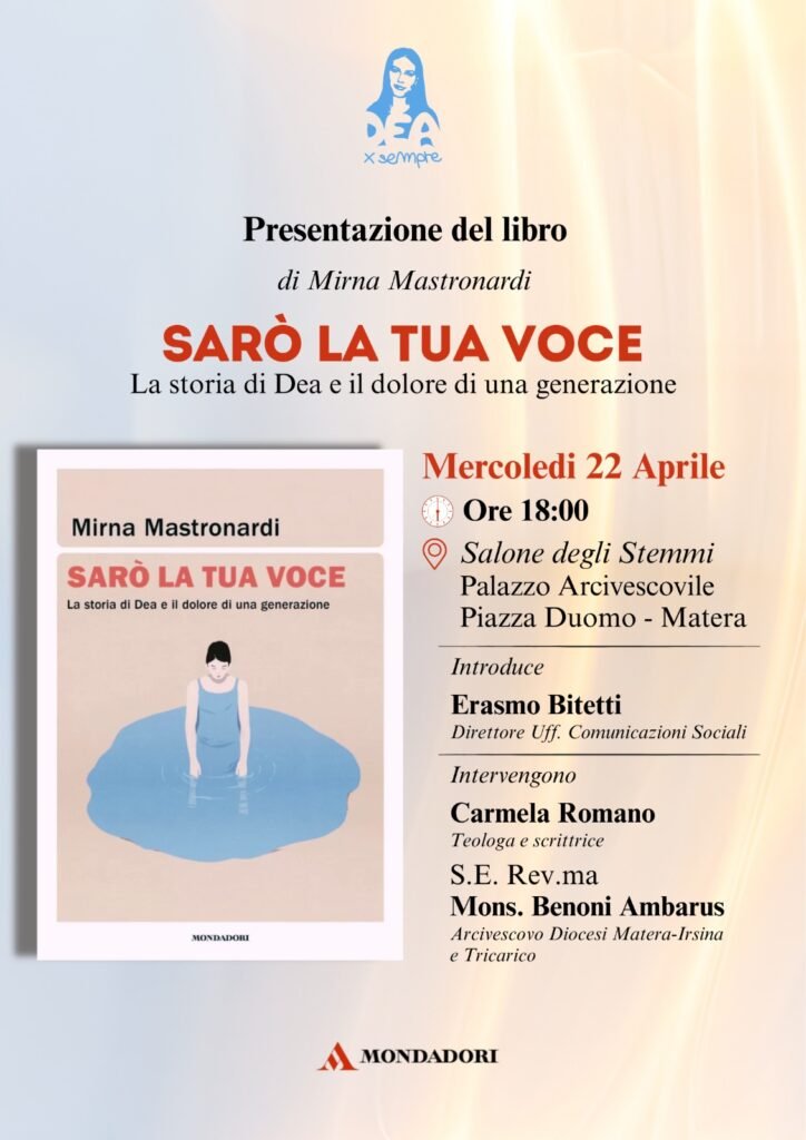 Mercoledì 22 aprile 2026 alle ore 18, nel Salone degli Stemmi del Palazzo Arcivescovile di Matera in Piazza Duomo, è in programma la presentazione del libro di Mirna Mastronardi “Sarò la tua voce, la storia di Dea e il dolore di una generazione” pubblicato da Mondadori.