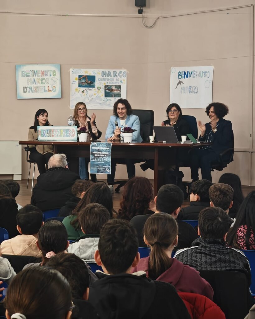 L’incontro, dal titolo “L’inclusione è possibile. Conosciamo l’autismo con la storia di Marco” è stato introdotto dalla dirigente scolastica, la prof.ssa Arcangela Paolicelli, e organizzato e coordinato dalla prof.ssa Maria Bruna Panico, referente per l’inclusione scolastica della scuola secondaria dell’Istituto. Presenti anche la giornalista Rossella Montemurro che su di lui ha scritto il libro Il mio tuffo nei sogni. Marco D’Aniello, una storia di sport e amicizia (Altrimedia Edizioni, prefazione di Mara Venier, il volume nel 2022 ha ottenuto in Campidoglio il prestigioso riconoscimento nella sezione “Letteratura” dell’evento “Roma premia la cultura sociale”) e i genitori di Marco, Cinzia Vozza e Roberto D’Aniello.