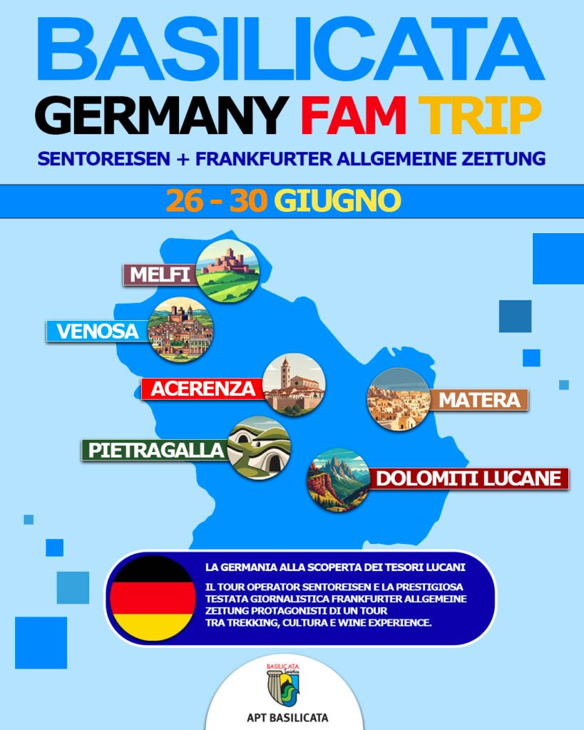 L’Agenzia di Promozione Territoriale della Basilicata rilancia la strategia di internazionalizzazione dell’offerta turistica regionale con un press tour dedicato al mercato tedesco, programmato per la stagione primavera-estate 2025 da domani 26 giugno al 30 giugno. L’iniziativa vedrà protagonisti operatori di primo piano del panorama turistico e mediatico tedesco: il tour operator SENTOREISEN e la prestigiosa testata Frankfurter Allgemeine Zeitung con la giornalista Ulrike Hund.