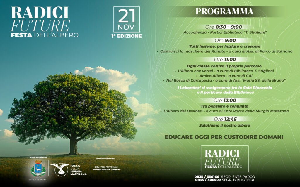 Un’occasione per riscoprire il legame con la natura, condividere buone pratiche e riconoscere negli alberi un simbolo di radici, memoria e futuro. L’Ente Parco della Murgia Materana, in collaborazione con la Biblioteca Provinciale “Tommaso Stigliani”, presenta la prima edizione della “Festa dell’Albero 2025 – Radici Future”, in programma venerdì 21 novembre 2025 a Matera, negli spazi della Biblioteca e nei portici antistanti.