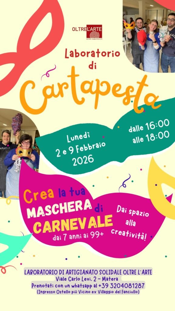 Dopo il successo dei laboratori natalizi, tornano il 2 e il 9 febbraio dalle 16 alle 18 gli incontri promossi dal Maestro Uccio Santochirico, direttore del Laboratorio di Artigianato Solidale della Cooperativa Oltre l’Arte. Questa volta è un Laboratorio di Cartapesta dedicato al carnevale: si realizzerà una maschera partendo da zero e preparando insieme la colla organica di farina.