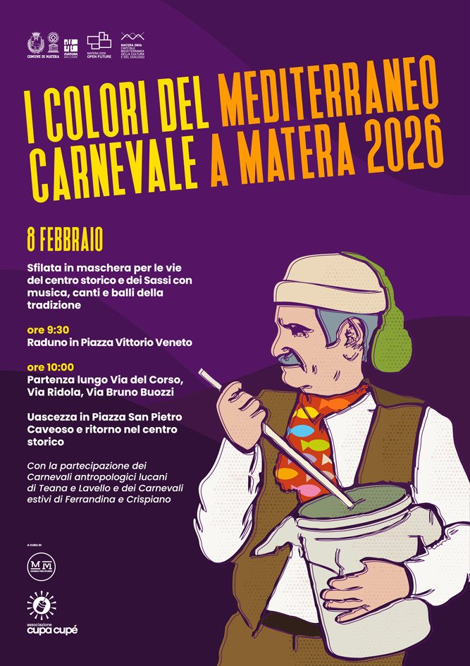 Il Carnevale a Matera 2026 – I Colori del Mediterraneo è promosso dal Comune di Matera e dalla Fondazione Matera Basilicata 2019, ed è organizzato dall’Associazione Cupa Cupé e da M.M. Società Cooperativa.