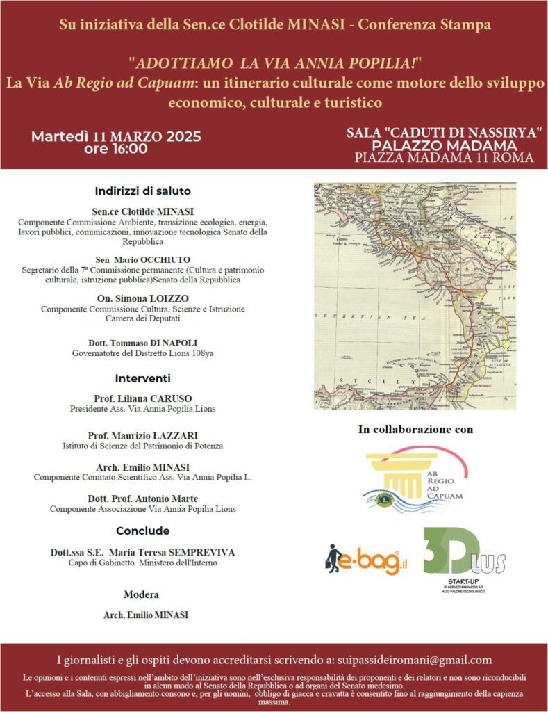Alla presenza di rappresentanti della Commissione Cultura, martedì 11 marzo 2025, alle ore 16:00, presso la sala Caduti di Nassirya del Senato della Repubblica, sarà presentato il progetto pilota “Via Annia Popilia Lion”.