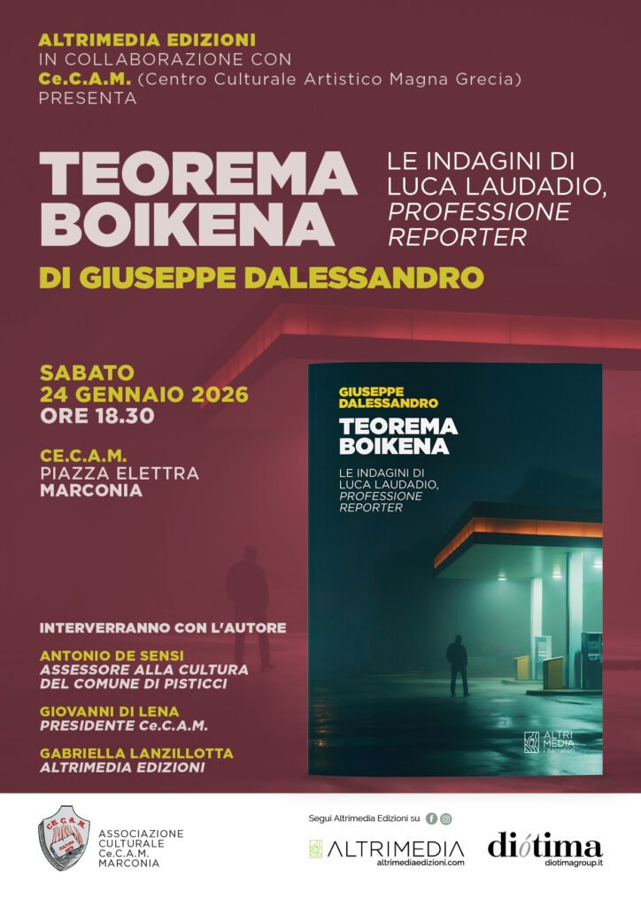 Il calendario delle presentazioni di “Teorema Boikena. Le indagini di Luca Laudadio, professione reporter” (Altrimedia Edizioni) di Giuseppe Dalessandro, si arricchisce di una nuova data: Marconia.
