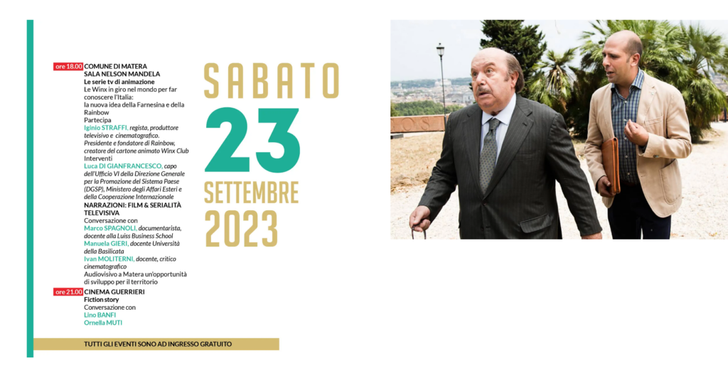 Per “Narrazioni: film & serialità televisiva” conversazione con Marco Spagnoli (documentarista, docente alla Luiss Business School), Manuela Gieri (Docente Università della Basilicata) e Ivan Molitern docente, critico cinematografico che relazionerà su “Audiovisivo a Matera un’opportunità di sviluppo per il territorio”.