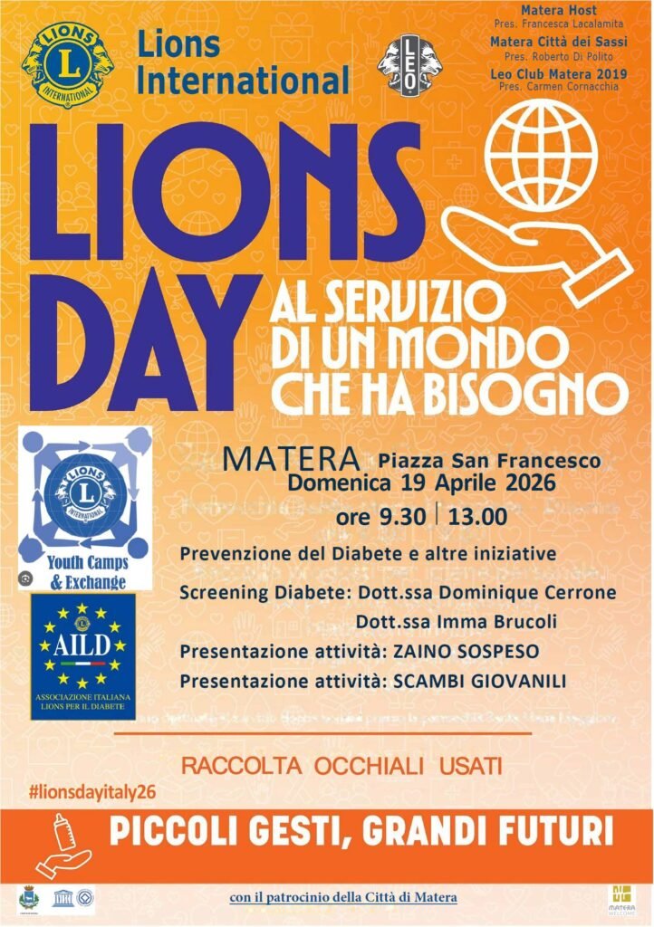 Domenica 19 aprile dalle ore 9,30 alle ore 13 in Piazza San Francesco di Matera, i Lions Club Matera Host, Matera Città dei Sassi e Leo Club Matera 2019, in collaborazione con l’Associazione Italiana Lions per il Diabete AILD, effettueranno lo screening gratuito del diabete, la presentazione dello zaino sospeso e degli Scambi giovanili e la raccolta degli occhiali usati.
