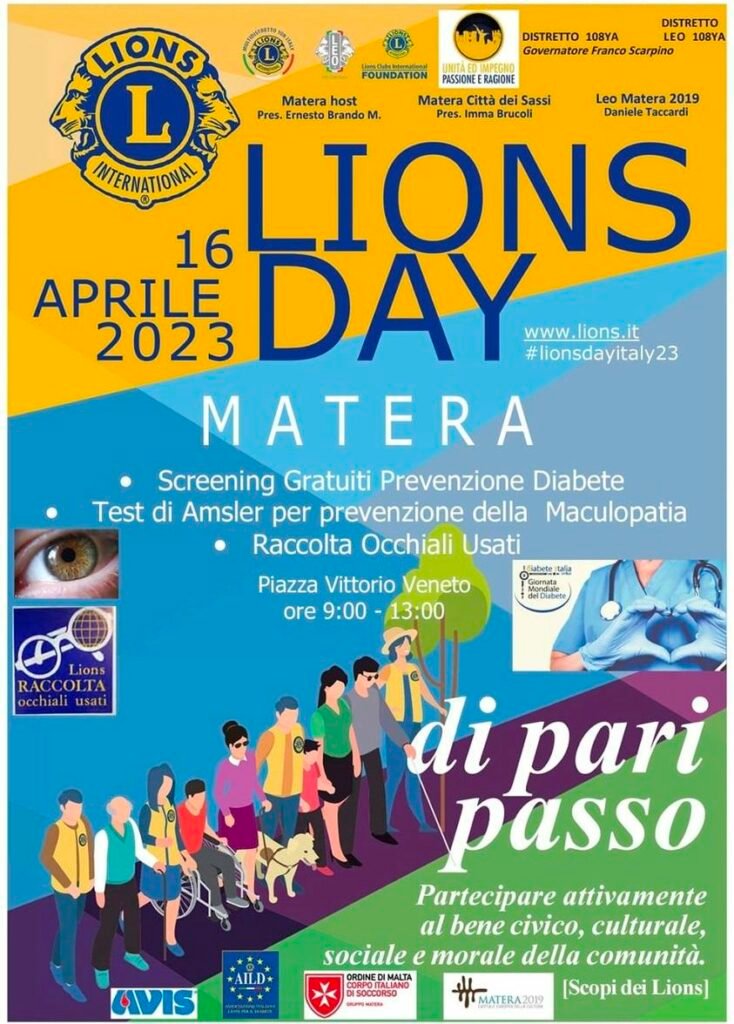 I Lions Club Matera Host, Matera Città dei Sassi e Leo Club Matera 2019, in collaborazione con l’Associazione Italiana Lions per il Diabete AILD, domenica 16 aprile dalle ore 9 alle ore 13 in Piazza Vittorio Veneto di Matera, effettueranno lo screening gratuito del diabete e il test di Amsler per la prevenzione della maculopatia a cui potranno partecipare tutti i cittadini che lo vorranno. Inoltre, contestualmente, si provvederà alla raccolta degli occhiali usati.