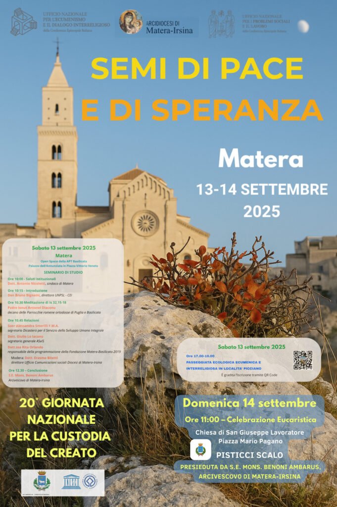 Dal 13 al 14 settembre 2025, la diocesi di Matera-Irsina accoglierà la 20ª Giornata Nazionale per la Custodia del Creato, promossa dall’Ufficio nazionale per l’ecumenismo e il dialogo interreligioso e dall’Ufficio nazionale per i problemi sociali e il lavoro della CEI.