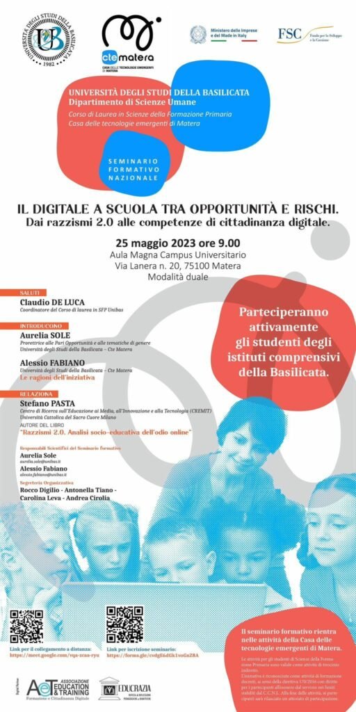 Giovedì 25 maggio 2023 presso l’Aula Magna del Campus di Matera si terrà il Seminario formativo nazionale “IL DIGITALE A SCUOLA TRA OPPORTUNITÀ E RISCHI. Dai razzismi 2.0 alle competenze di cittadinanza digitale.” L’iniziativa è organizzata dal Corso di Laurea in Scienze della Formazione Primaria unitamente alla Casa delle tecnologie emergenti di Matera.