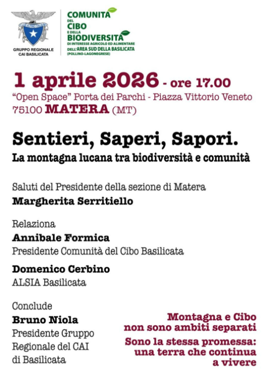 Ad aprire il confronto saranno gli interventi di Margherita Serritiello, Presidente CAI Matera, Annibale Formica, Presidente della Comunità del Cibo Basilicata, Domenico Cerbino di ALSIA Basilicata e Bruno Niola, Presidente del Gruppo Regionale CAI Basilicata.