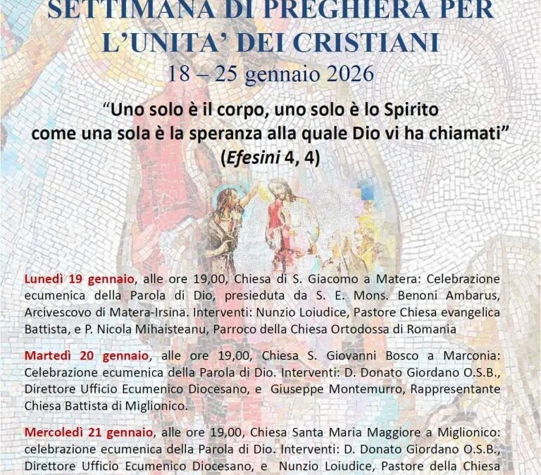 Dal 18 al 25 gennaio 2026 Matera e il territorio circostante ospiteranno la Settimana di preghiera per l’unità dei cristiani, tradizionale appuntamento ecumenico che vede coinvolte diverse comunità cristiane presenti sul territorio.