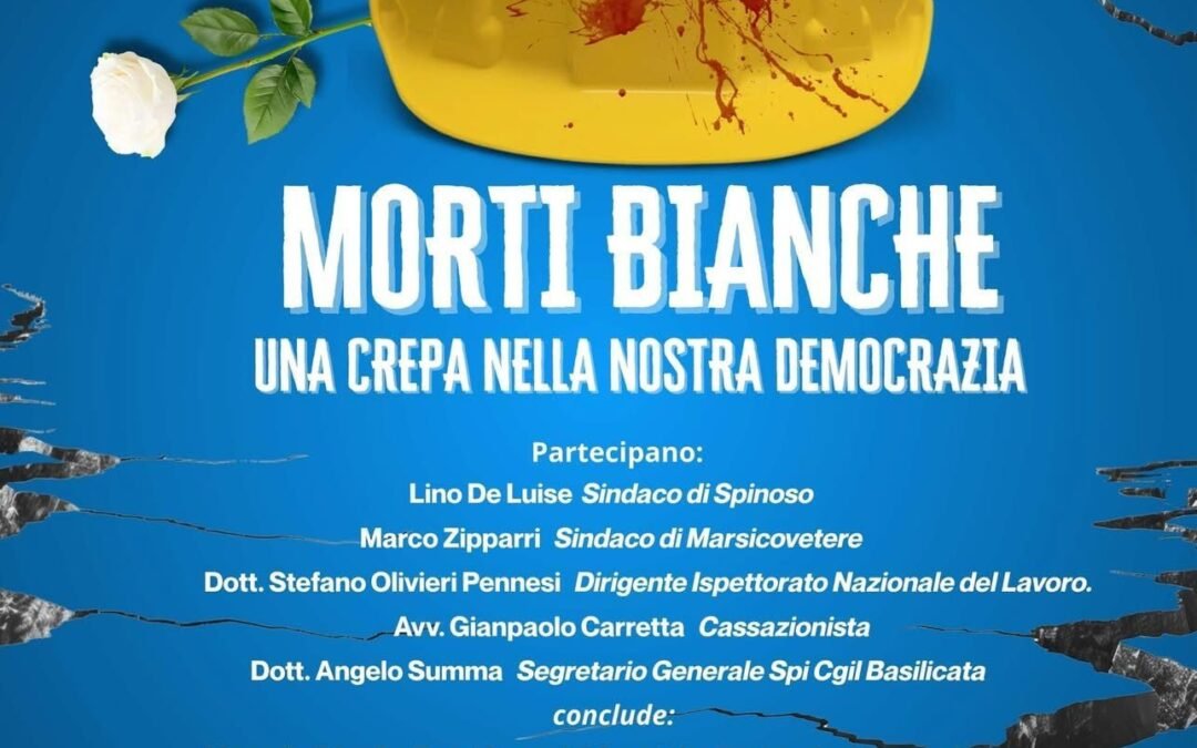 Questa sera, domenica 28 settembrem alle ore 17 nel Salone del Consiglio Comunale all’interno del Palazzo Ranone a Spinoso è in programma il convegno “Morti bianche: una crepa nella nostra democrazia”. Nel Cavedio del Palazzo Ranone alle ore 19 sarà presentato lo spettacolo teatrale “Bianco – dedicato a chi il lavoro ha rubato i giorni” della Compagnia Teatrale Oreventuno di Tito. Una rappresentazione che tocca, scuote, fa riflettere; uno spettacolo che è un grido silenzioso, un abbraccio collettivo, una voce che si fa teatro, perché le “morti bianche” non sono solo numeri: sono nomi, storie famiglia.