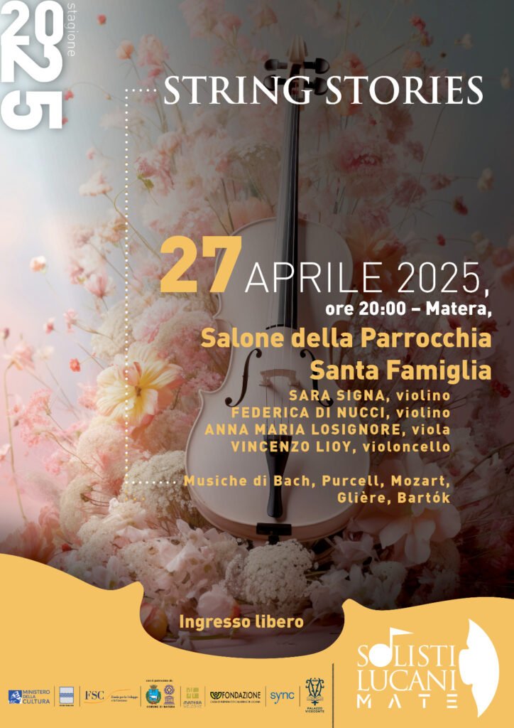 Domenica 27 aprile 2025 alle ore 20:00, a Matera presso il Salone della Parrocchia Santa Famiglia di Matera, si terrà il concerto “String Stories”, nell’ambito della Stagione Concertistica 2025 dell’Associazione Matè e Solisti Lucani.