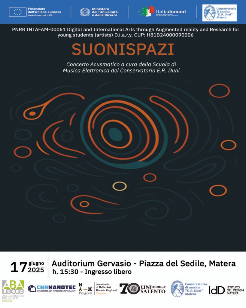 Tali opere troveranno uno spazio autonomo nel concerto acusmatico Suonispazi che si terrà il 17 giugno alle ore 15:30 presso l’Auditorium Gervasio in Piazza del Sedile a Matera. L’ingresso è libero fino ad esaurimento posti.