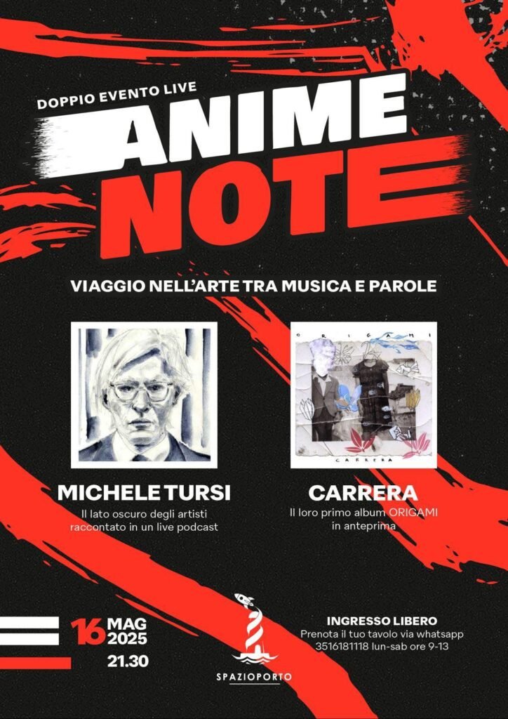 Venerdì 16 maggio, doppio evento live alle 21.30 a SpazioPorto in via Niceforo Foca 28 a Taranto con “Anime Note”.