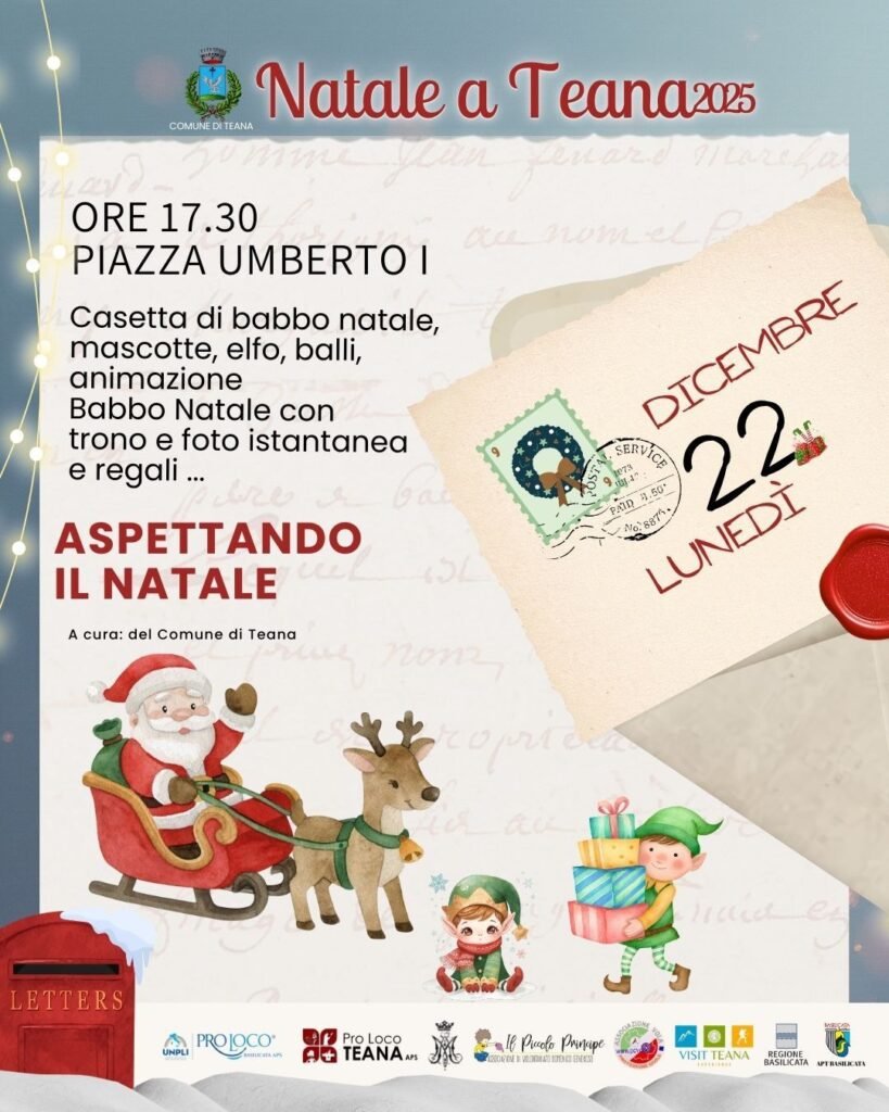 Teana si prepara a vivere uno degli appuntamenti più attesi del periodo natalizio. Nell’ambito del cartellone “Natale a Teana 2025”, promosso dall’Amministrazione comunale, lunedì 22 dicembre 2025, a partire dalle ore 17.30, Piazza Umberto I ospiterà l’evento “Aspettando il Natale”, dedicato in particolare a famiglie e bambini.