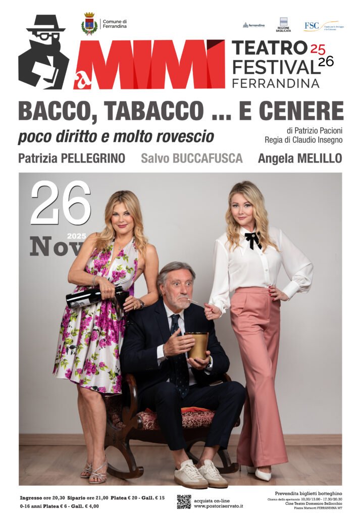 Il Teatro Festival Ferrandina – A Mimì, mercoledì 26 novembre, inaugura la nuova stagione 2025/26 con una commedia brillante e irresistibile: “Bacco, Tabacco… e Cenere – poco diritto e molto rovescio”, scritta da Patrizio Pacioni e diretta da Claudio Insegno.
