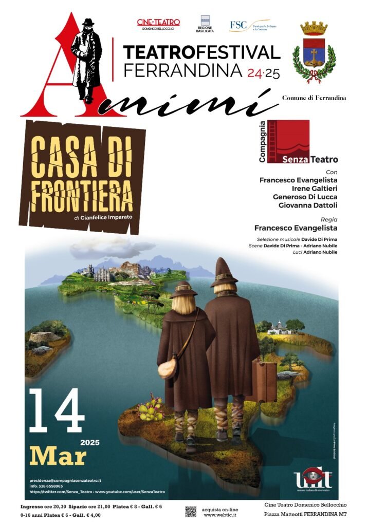 Venerdì 14 e sabato 15 marzo doppio appuntamento con la compagnia Senzateatro. La compagnia di Ferrandina presenta, nel cartellone serale e nella matinée riservata agli studenti degli Istituti superiori, la commedia di Gianfelice Imparato “Casa di frontiera”.