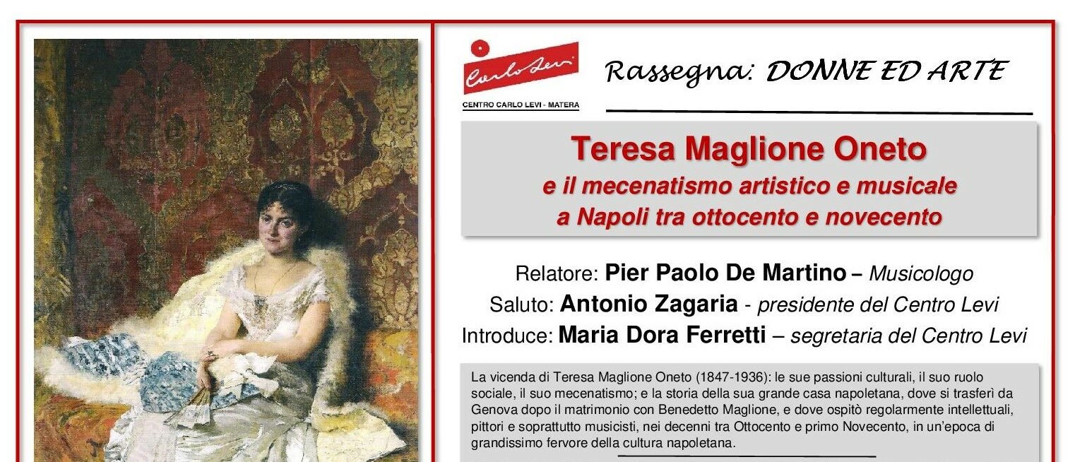L’incontro di venerdì prossimo offrirà uno squarcio sulla temperie culturale della Napoli fin de siècle: una città che perso lo status di capitale politica, tra fine Ottocento e inizio Novecento, compensò questa “retrocessione” con un impressionante fervore artistico e intellettuale. In tale contesto si colloca la storia di Teresa Oneto, donna colta, aperta, curiosa, figlia di un ricco banchiere genovese, che dopo il matrimonio con Benedetto Maglione, a sua volta figlio di un esponente di spicco dell’élite liberale napoletana, si trasferì ventenne nell’ex capitale borbonica. Commissionando e collezionando opere, finanziando iniziative, facendo del proprio salotto un luogo aperto ai maggiori pittori e musicisti del tardo Ottocento – da Domenico Morelli a Eduardo Dalbono, da Giovanni Bottesini a Giuseppe Martucci – Teresa Maglione Oneto esercitò per oltre cinquant’anni un ruolo importante nella promozione delle nuove tendenze artistico-musicali a cavallo fra i due secoli.