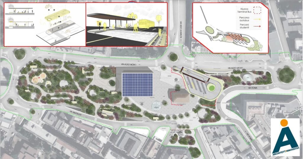 L’analisi di fattibilità prevede, inizialmente, la creazione di sei stalli per gli autobus, corredati da camminamenti pedonali progettati per garantire la massima sicurezza ai passeggeri. Con una progettazione più approfondita, sarà possibile raddoppiare il numero di stalli sfruttando l’area adiacente alla nuova rotatoria, migliorando ulteriormente la capacità del terminal.