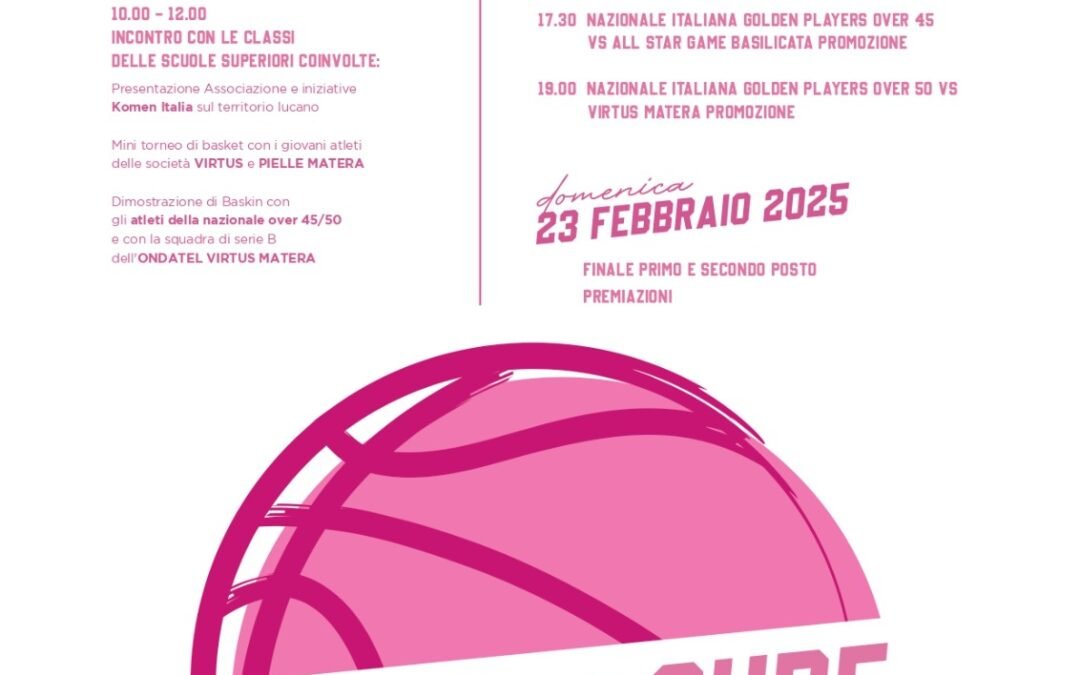 L’iniziativa rappresenta il primo appuntamento importante del 2025 organizzato dal Comitato Basilicata di Komen Italia. La manifestazione, patrocinata dal Comune di Matera e in collaborazione con la Federazione Italiana Pallacanestro Basilicata e le società sportive Virtus, Pielle, Invicta Potenza, LIONS Basket Potenza, ASD Grizzly, A.S. Pallacanestro Senise, avrà la durata di due giorni e vedrà protagoniste le squadre di basket della città oltre che i campioni della Nazionale Italiana Golden Players Over 45 e 50, la Nazionale Golden Players femminile Over 50 e il team All Star Game Basilicata, con tornei che si terranno nel pomeriggio di sabato 22 febbraio e nella mattinata di domenica 23 febbraio, quando saranno disputate la semifinale e la finale del torneo.