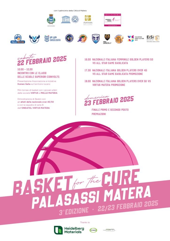 L’iniziativa rappresenta il primo appuntamento importante del 2025 organizzato dal Comitato Basilicata di Komen Italia. La manifestazione, patrocinata dal Comune di Matera e in collaborazione con la Federazione Italiana Pallacanestro Basilicata e le società sportive Virtus, Pielle, Invicta Potenza, LIONS Basket Potenza, ASD Grizzly, A.S. Pallacanestro Senise, avrà la durata di due giorni e vedrà protagoniste le squadre di basket della città oltre che i campioni della Nazionale Italiana Golden Players Over 45 e 50, la Nazionale Golden Players femminile Over 50 e il team All Star Game Basilicata, con tornei che si terranno nel pomeriggio di sabato 22 febbraio e nella mattinata di domenica 23 febbraio, quando saranno disputate la semifinale e la finale del torneo.