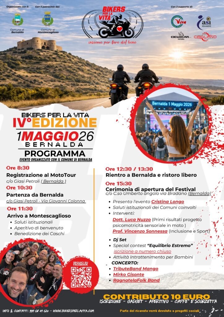 Motori, solidarietà e inclusione tornano protagonisti con la IV edizione di “Bikers per la Vita”, l’evento che unisce la passione per le due ruote a un importante impegno sociale. L’iniziativa è organizzata con il Comune di Bernalda, con il patrocinio del Comune di Montescaglioso e con il supporto di Associazione Viva, commercianti di Bernalda e Metaponto, ASI Settore Mototerapia, Ciclocar S.r.l. Matera, e l’Autofficina Cirigliano.“Bikers per la Vita” nasce come realtà associativa con l’obiettivo di trasformare la passione per le moto in uno strumento concreto di solidarietà. Negli anni, l’associazione si è distinta per l’impegno in iniziative sociali e benefiche, promuovendo inclusione, sensibilizzazione e supporto a progetti rivolti alla comunità, con particolare attenzione alle persone più fragili. Attraverso eventi, motoraduni e attività sul territorio, il gruppo ha costruito una rete partecipata che unisce motociclisti, famiglie e istituzioni nel segno della condivisione e dell’aiuto reciproco.La giornata prenderà il via alle ore 8:30 con la registrazione dei partecipanti al MotoTour presso Giasi Petroli a Bernalda. Alle 10:30 partirà il tour motociclistico che condurrà i bikers fino a Montescaglioso, dove è previsto l’arrivo alle ore 11:30 con saluti istituzionali, aperitivo di benvenuto e benedizione dei caschi, momento simbolico che sottolinea il valore della sicurezza e della comunità.Dopo il rientro a Bernalda, previsto tra le 12:30 e le 13:30, i partecipanti al motogiro potranno usufruire del ristoro presso le strutture ricettive convenzionate tra le 13:30 e le 14:00.Il contributo di partecipazione al motogiro è di 10 euro e comprende iscrizione, gadget, aperitivo, caffè e scorzetta; è riservato esclusivamente ai partecipanti del motogiro. L’evento è gratuito e aperto a tutti. Parte del ricavato sarà devoluto a progetti sociali, confermando la missione solidale dell’iniziativa.Il pomeriggio entrerà nel vivo alle 15:30 con la cerimonia ufficiale di apertura del festival, presso Corso Umberto (angolo via Bradano). A presentare l’evento sarà la giornalista Cristina Longo, affiancata dai saluti istituzionali e da interventi di rilievo, tra cui quelli del Dott. Luca Nuzzo, che illustrerà i primi risultati di un progetto sulla psicomotricità sensoriale in moto, e del Prof. Vincenzo Sonnessa, con un focus su inclusione e sport.Il programma proseguirà con un DJ set, il contest “Equilibrio Estremo” a numero chiuso, attività di intrattenimento per bambini e, in serata, concerti dal vivo con la Tribute Band Mango, Mirko Gisonte e la Ragnatela Folk Band.Per informazioni: 339 68 41 620Sito web: www.bikersperlavita.com“Insieme per fare del bene” è il messaggio che accompagna anche quest’anno un evento capace di unire passione e responsabilità sociale.