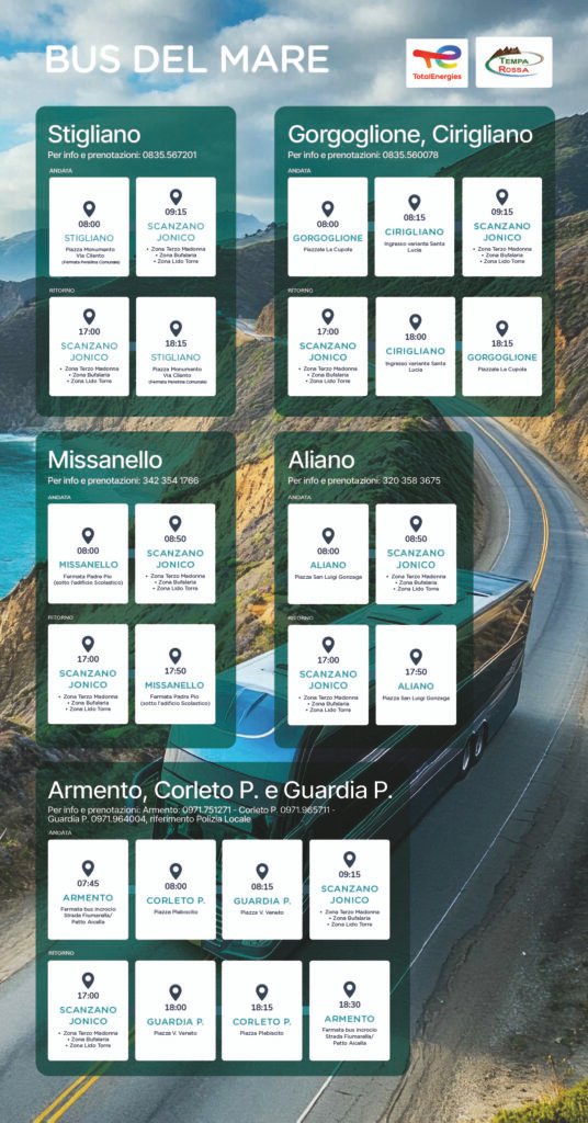 La Compagnia, insieme ai partner della JV Tempa Rossa, rilancia le navette gratuite verso le coste di Scanzano Jonico, con partenze da Armento, Corleto Perticara, Guardia Perticara, Missanello, Aliano, Cirigliano, Gorgoglione, Stigliano