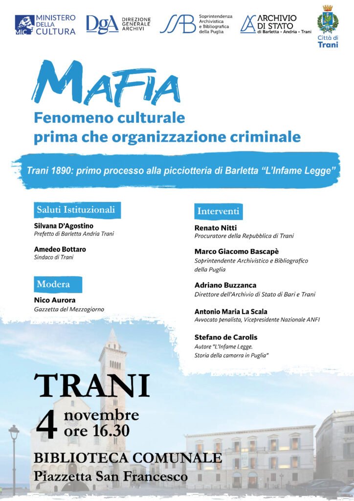Martedì 4 novembre alle ore 16.30, presso la Biblioteca Comunale di Trani (Piazzetta San Francesco), si terrà l’incontro dal titolo “Mafia: Fenomeno culturale prima che organizzazione criminale –Trani 1890: primo processo alla picciotteria di Barletta ‘L’Infame Legge’”.
