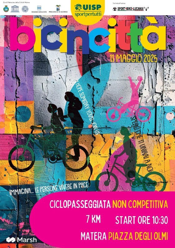 L’11 maggio torna la manifestazione del Bicincittà, il più grande evento su due ruote nella Città dei Sassi. Il ritrovo è alle ore 11.00 in piazza degli Olmi, per un percorso di circa 7 km: una preziosa occasione per vivere la città in modo nuovo, verso una mobilità più sana, sostenibile e per tutti. Le iscrizioni sono già possibili presso la sede del Comitato Uisp di Matera (Via Ettore Maiorana, 82) al costo di 5€, dal lunedì al venerdì, dalle ore 10:30-12:30 / 16:30-18:30. Le iscrizioni sono possibili anche la mattina dell’evento, presso il punto accoglienza, al costo di 9€.