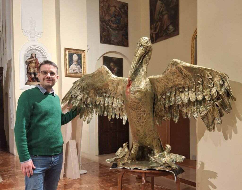 “Don Mattia Albano, parroco della chiesa di Sant’Antonio di Pisticci, in occasione della Pasqua 2026, voleva benedire l’altare della reposizione con una scultura in cartapesta che raffigurasse il pellicano”, spiega il Maestro. “Come vuole la tradizione, il pellicano simboleggia il sacrificio di Cristo sulla croce e nello specifico, nel corso dei secoli, è stato rappresentato in varie modalità e in varie situazioni a partire dalle sculture in pietra, legno o sugli altari con rilievi, bassorilievi, bronzo, terracotta, o ancora sui paramenti che abbelliscono gli altari o quelli indossati dai sacerdoti nei momenti particolari della liturgia dell’anno.