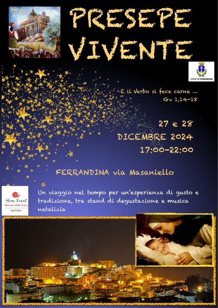 Una piccola Betlemme nel centro storico di Ferrandina. La Pro Loco presieduta dal presidente Rocco Zito è pronta ad accogliere residenti e visitatori nel suggestivo scenario di Via Masaniello, dove nei giorni 27 e 28 dicembre dalle ore 17 alle 22, con il patrocinio dell’Amministrazione Comunale di Ferrandina, verrà allestito il Presepe Vivente. L’iniziativa che si connota con una impronta di grande spiritualità, rievocando la Natività del Signore, pone in risalto oltre che la bellezza del vecchio abitato del paese, le tradizioni ed i mestieri di Ferrandina. Un percorso, quello del Presepe Vivente di Borgo Masaniello, che è stato concepito per riscoprire e valorizzare le radici storico-artistiche della cultura e delle tradizioni del territorio ferrandinese. La magia del Natale risplenderà tra i vicoli illuminati dalle fiaccole e la presenza di figuranti in costumi d’epoca ma percorrendo il selciato delle stradine della parte bassa del centro abitato di Ferrandina si potrà percepire un percorso sensoriale ed esperienziale tra tutti gli antichi sapori, i profumi ed i suoni della nostra terra. E così, in luogo che trasuda ancora gli echi della civiltà contadina, si ritornerà idealmente indietro nel tempo tra vie, archi e corti riproponendo scene di vita quotidiana e ambientando le botteghe degli antichi mestieri. Immersi nel clima della festa i visitatori lungo l’itinerario, anche con la collaborazione della Condotta Slow Food di Matera, potranno degustare i tipici prodotti enogastronomici natalizi, tra cui le crespelle, le pettole e il pane abbrustolito sulla brace e condito con l’olio nuovo. Ed ancora i dolci della tradizione natalizia. I suoni delle cornamuse e delle ciaramelle allieteranno le viuzze del presepe, mentre le piccole stalle ospiteranno alcuni animali. «L’allestimento del Presepe Vivente nel Borgo Masaniello – dichiara Rocco Zito, presidente della Pro Loco di Ferrandina – vuole rappresentare una forma di attrazione per i visitatori interessati a scoprire o ad approfondire le tradizioni locali, contribuendo così allo sviluppo del turismo religioso e culturale del territorio ferrandinese».