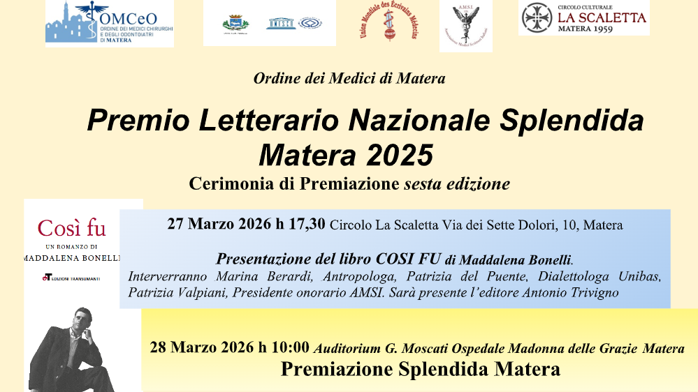 Torna con la sua VI Edizione “Splendida Matera”, il Premio Nazionale di Letteratura promosso dall’Ordine dei Medici Chirurghi e degli Odontoiatri della Provincia di Matera, divenuto negli anni uno degli appuntamenti culturali più apprezzati nel panorama dei medici scrittori italiani.
